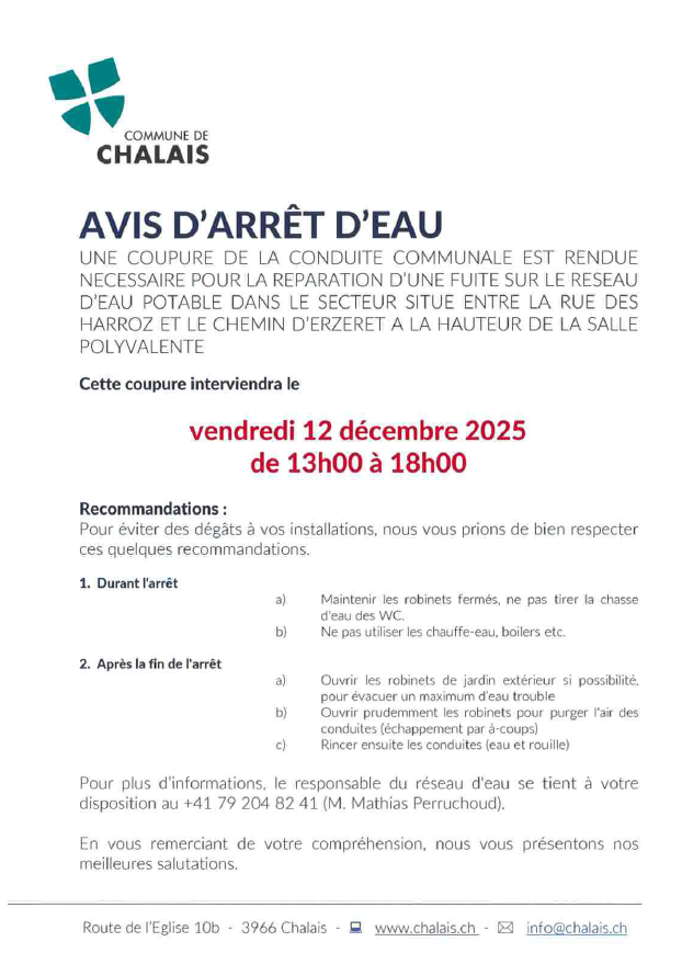 accueil / Découvrir / Actualités / 12.12.2025 - 13h00 à 18h00 : Avis d'arrêt d'eau Rue des Harroz et Chemin de l'Erzeret