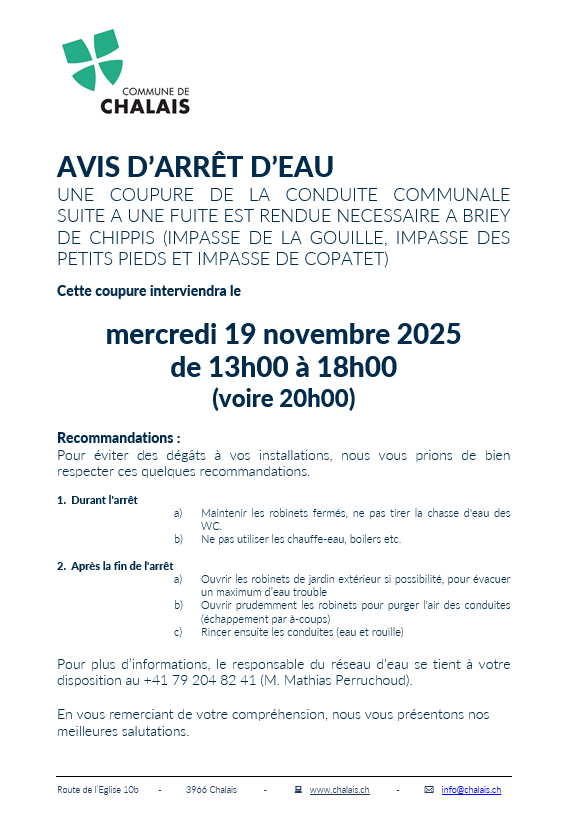 19.11.2025 13h00-18h00 (voire 20h00) : Avis arrêt d'eau