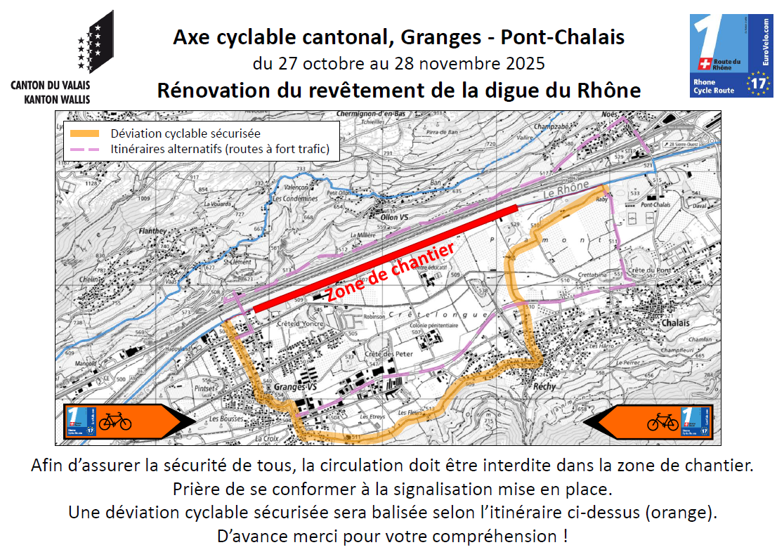La piste cyclable cantonale n°1 (RR1) le long de la digue du Rhône entre Granges et Pramont sera fermée à la circulation du 27.10.2025 à 07h00 au 28.11.2025 à 18h00. Une déviation est en place par Réchy.