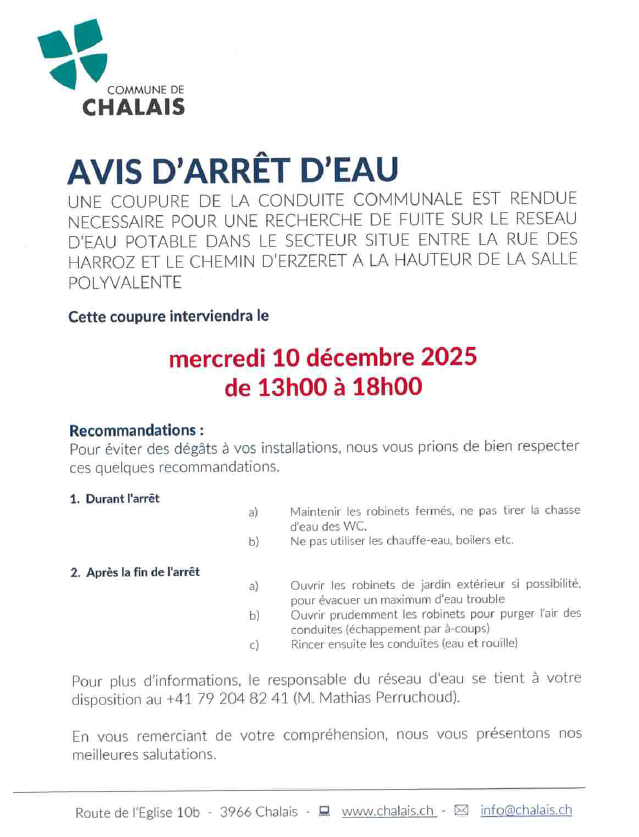 La fuite d'eau recherchée le 09.12.2025 a été trouvée et sera réparée le 10.12.2025. Une coupure d'eau sera donc nécessaire mercredi entre 13h00 et 18h00 à la hauteur de la salle polyvalente.