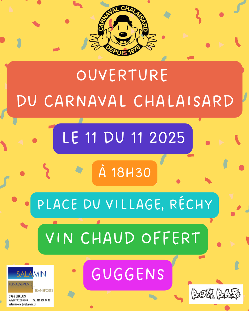 Le 11.11.2025 à 18h30, le Carnaval chalaisard lance les festivités carnavalesques 2026 ! Venez nombreux pour les encourager dans cette nouvelle édition d'un moment fort de notre commune. Petits et grands, bougez au son des guggens !