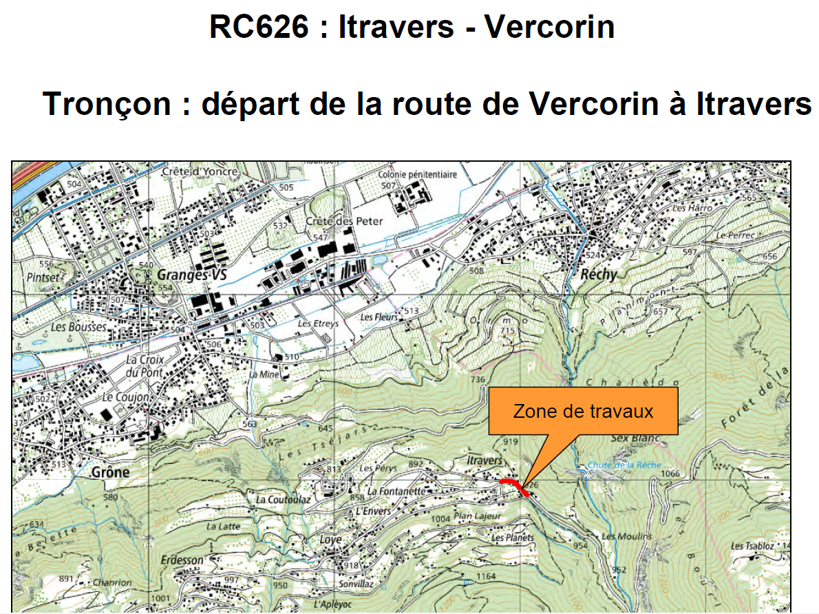 En complément de la fermeture actuelle, considérant la nécessité de procéder à des travaux de réfection de la chaussée à l'intérieur d'Itravers, la route Itravers - Vercorin ainsi que l'accès au Vallon de Réchy seront fermés à toute circulation du lundi 16 février 2026 à 8 h au vendredi 22 mai 2026 à 17 h.