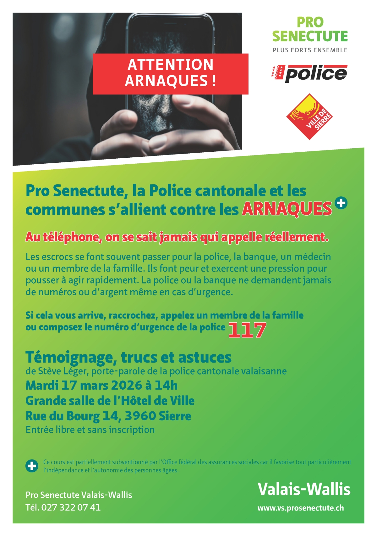 Afin d'aider la population à se prémunir contre les escrocs, la Ville de Sierre organise une conférence en collaboration avec Pro Senectute Valais et la Police Cantonale valaisanne.
