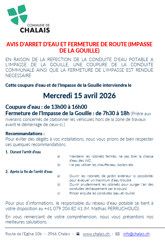 15.04.2026 : Fermeture de route et avis d'arrêt d'eau - Impasse de la Gouille
