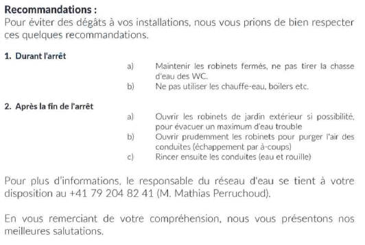 accueil / Informations importantes et alertes / Fin d'avis d'arrêt d'eau : Rue des Jardins et Rue des Champs Fleuris - Vercorin