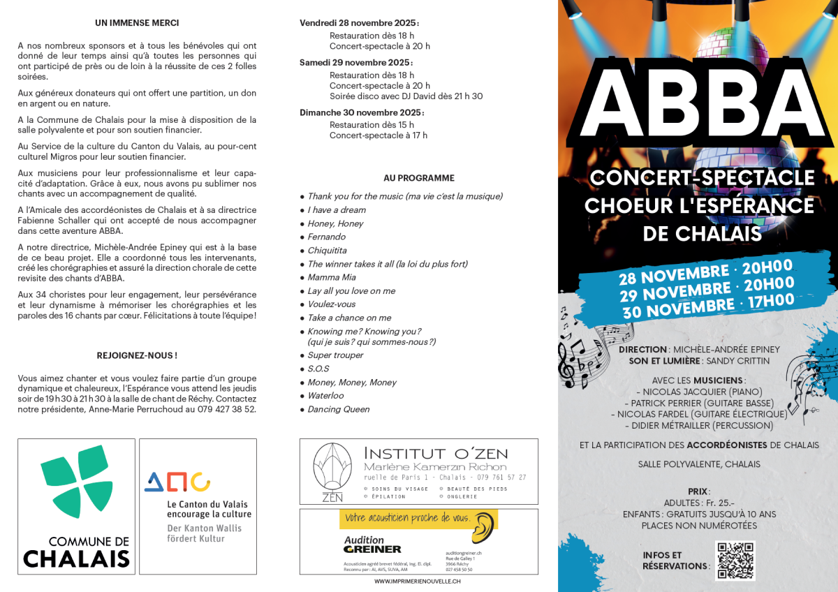 Au programme, une sélection des plus grands succès d’ABBA, de Dancing Queen à Mamma Mia, en passant par Waterloo, Voulez-vous et Super Trouper. Le chœur accompagné de musiciens talentueux et de l’Amicale des accordéonistes vous fera revivre ces classiques avec des harmonies vocales envoûtantes et une énergie contagieuse.